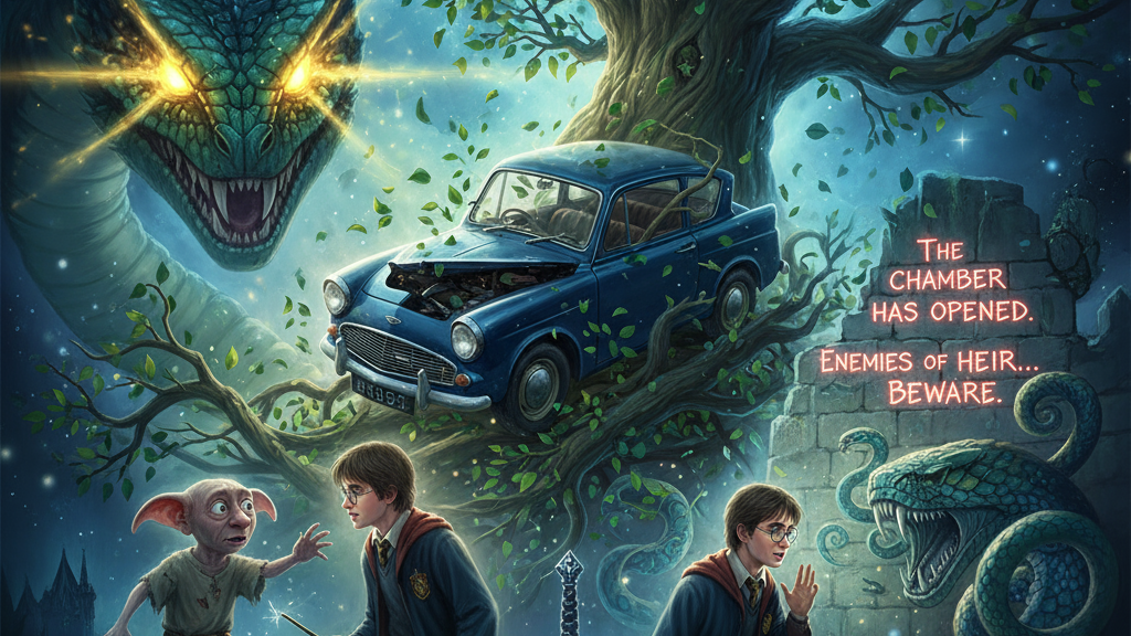 The school year begins with a series of ominous events. Gilderoy Lockhart proves to be an incompetent teacher, more interested in self-promotion than actual instruction. During a Quidditch practice, a rogue Bludger targets Harry, breaking his arm. Lockhart attempts to mend it but accidentally removes all the bones instead, sending Harry to the hospital wing. That night, Dobby visits Harry and reveals that he was responsible for sealing the barrier at King’s Cross and for jinxing the Bludger, all in an attempt to force Harry to leave Hogwarts.